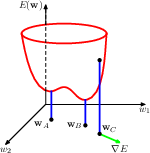 error function, local minimum A, global minimum B, and gradient at C