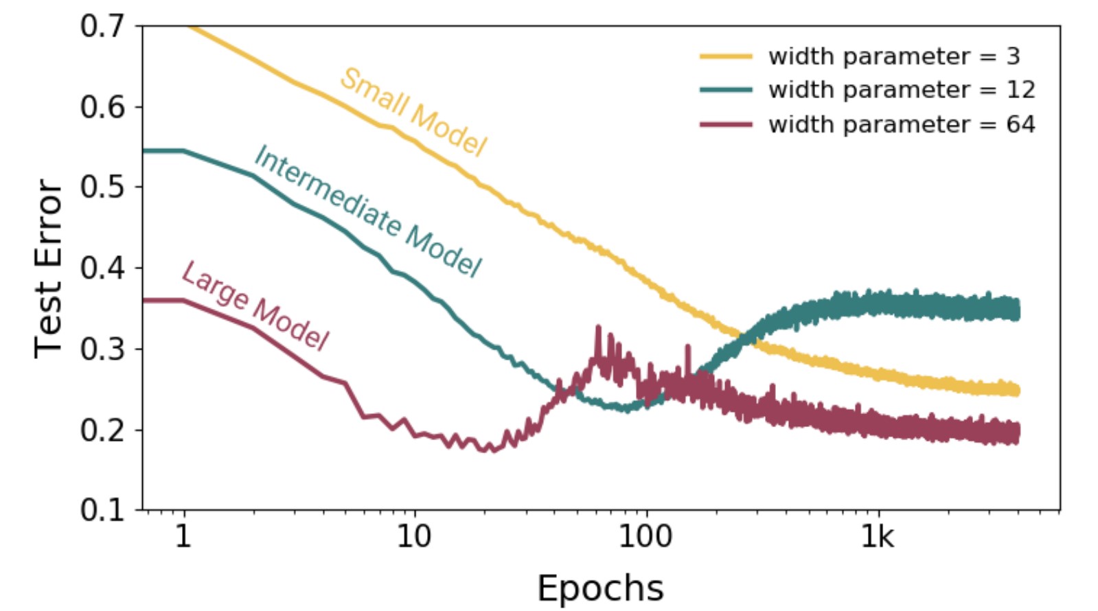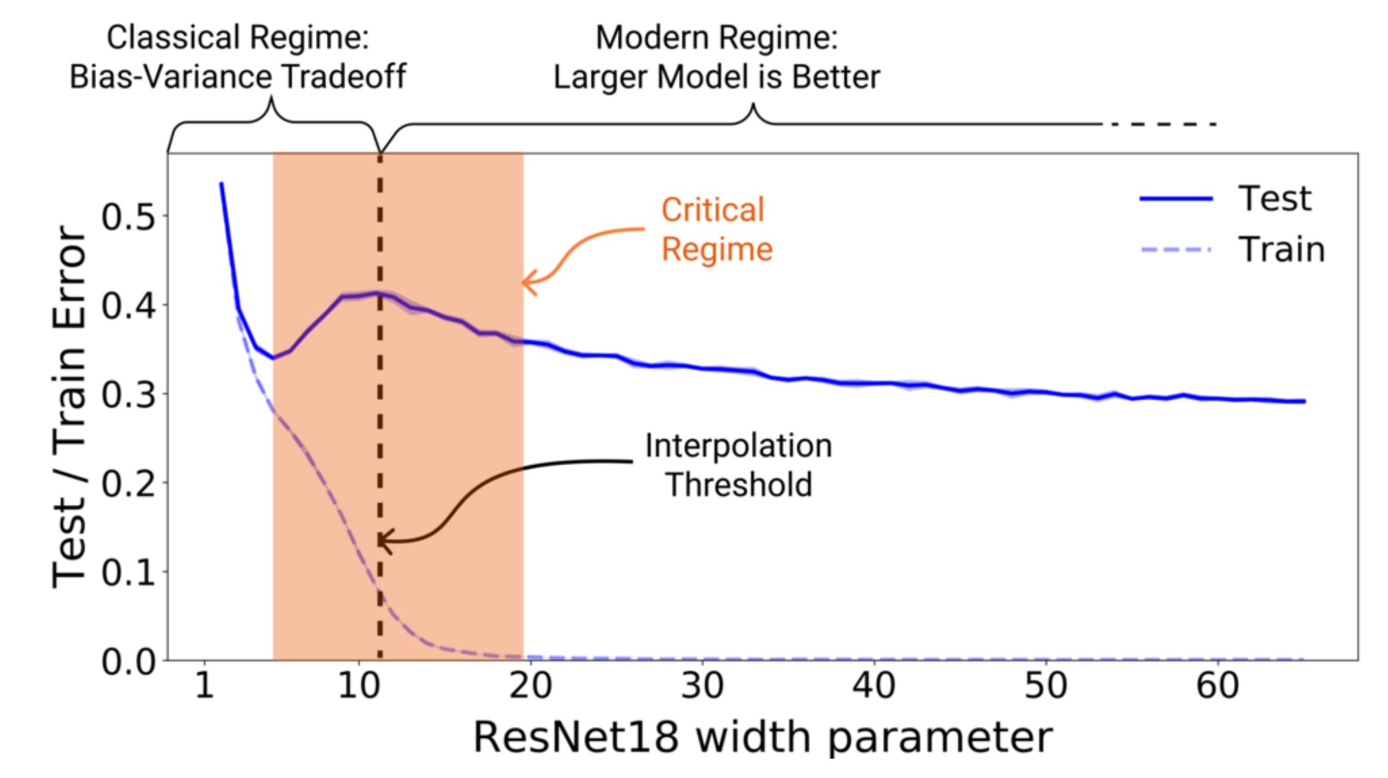 The black dashed line marks the interpolation threshold, where the model’s capacity is just enough to perfectly fit the training data.