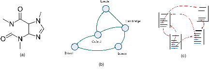 In previous chapters we have encountered structured data in the form of sequences and images, corresponding to one-dimensional and two-dimensional arrays of variables respectively. More generally, there are many types of structured data that are best described by a graph as illustrated in Figure 13.1. In general a graph consists of a set of objects, known as nodes, connected by edges. Both the nodes and the edges can have data associated with them. For example, in a molecule the nodes and edges are associated with discrete variables corresponding to the types of atom (carbon, nitrogen, hydrogen, etc.) and the types of bonds (single bond, double bond, etc.). For a rail network, each railway line might be associated with a continuous variable given by the average journey time between two cities. Here we are assuming that the edges are symmetrical, for example that the journey time from London to Cambridge is the same as the journey time from Cambridge to London. Such edges are depicted by undirected links between the nodes. For the worldwide web the edges are directed since if there is a hyperlink on page A that points to page B there is not necessarily a hyperlink on page B pointing back to page A.