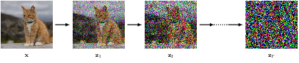 because each step of the transformation is Gaussian, we can combine the Gaussian transformations between any two random points in time; for this reason, we can derive the hidden variable distribution at any time using just the original image, and the noise schedule up to that time.