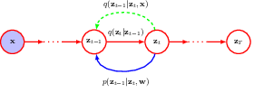 As a third attempt, we will further decompose the second term of the ELBO, again by applying the good old rules of probability. This time we apply them on the joint distribution of the adjacent latent variables in the forward encoder.