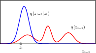 For the second term, we can first sample zt-1 using 20.3, then sample zt using 20.4, then we can compute p and q with no problem. This is procedurally right, however the estimation will be very noisy, since we consecutively did two sampling steps.