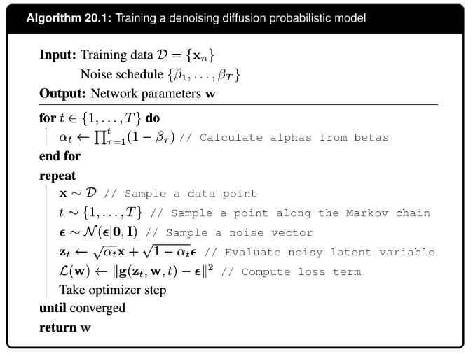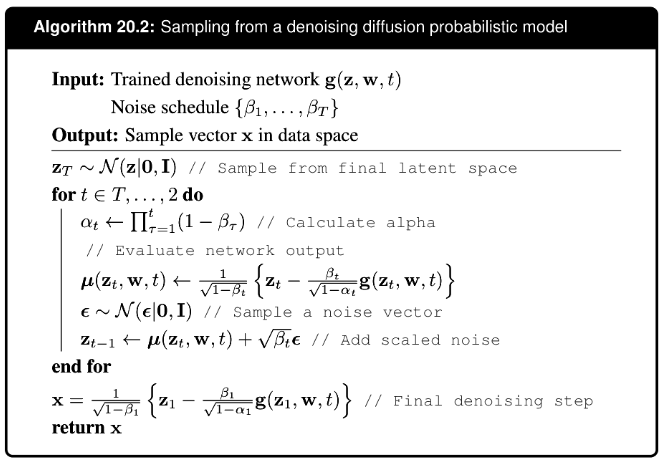 \[ \sigma_t^2 = \frac{\beta_t(1 - \alpha_{t-1})}{1 - \alpha_t} \quad (20.17) \]